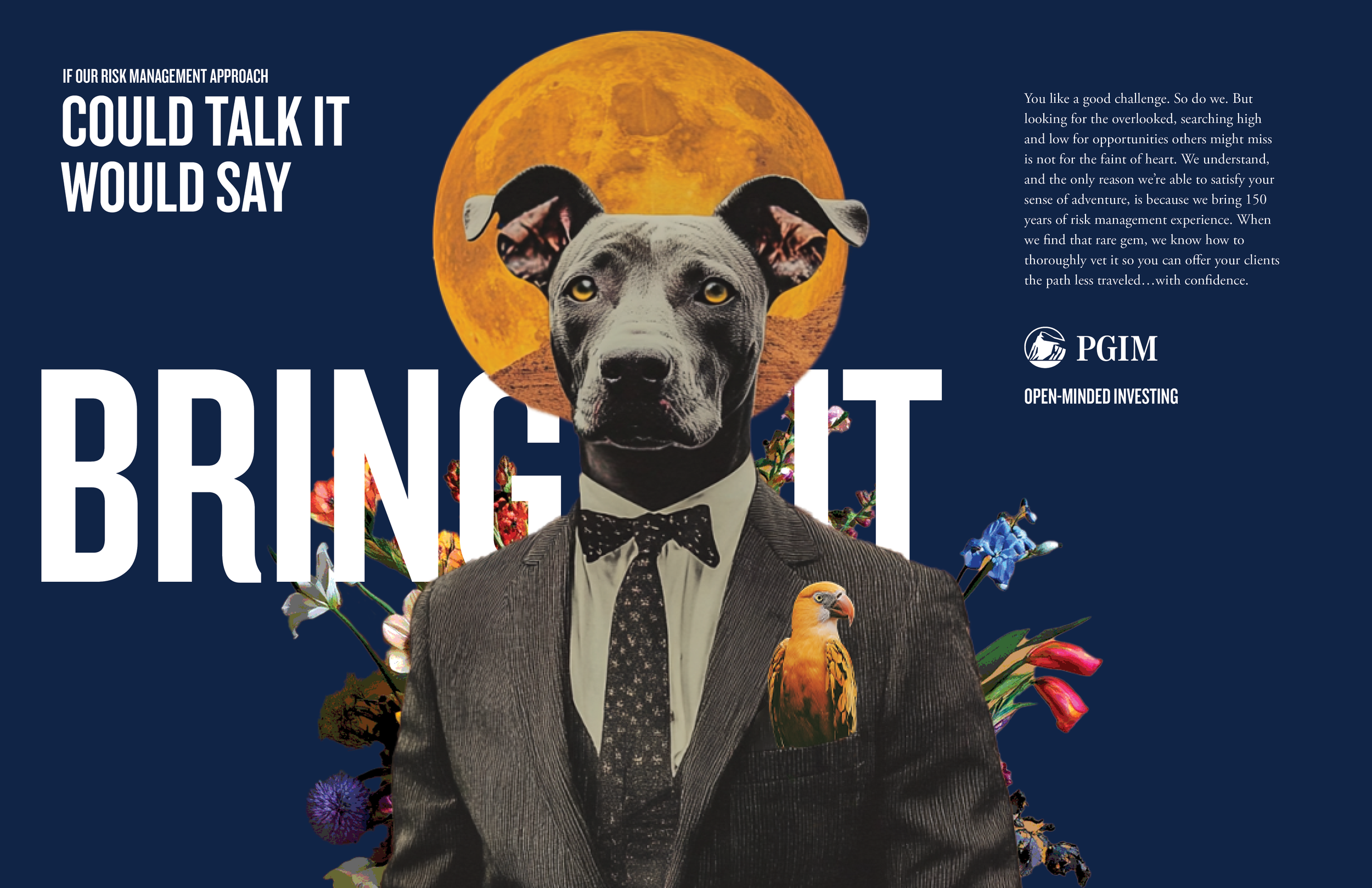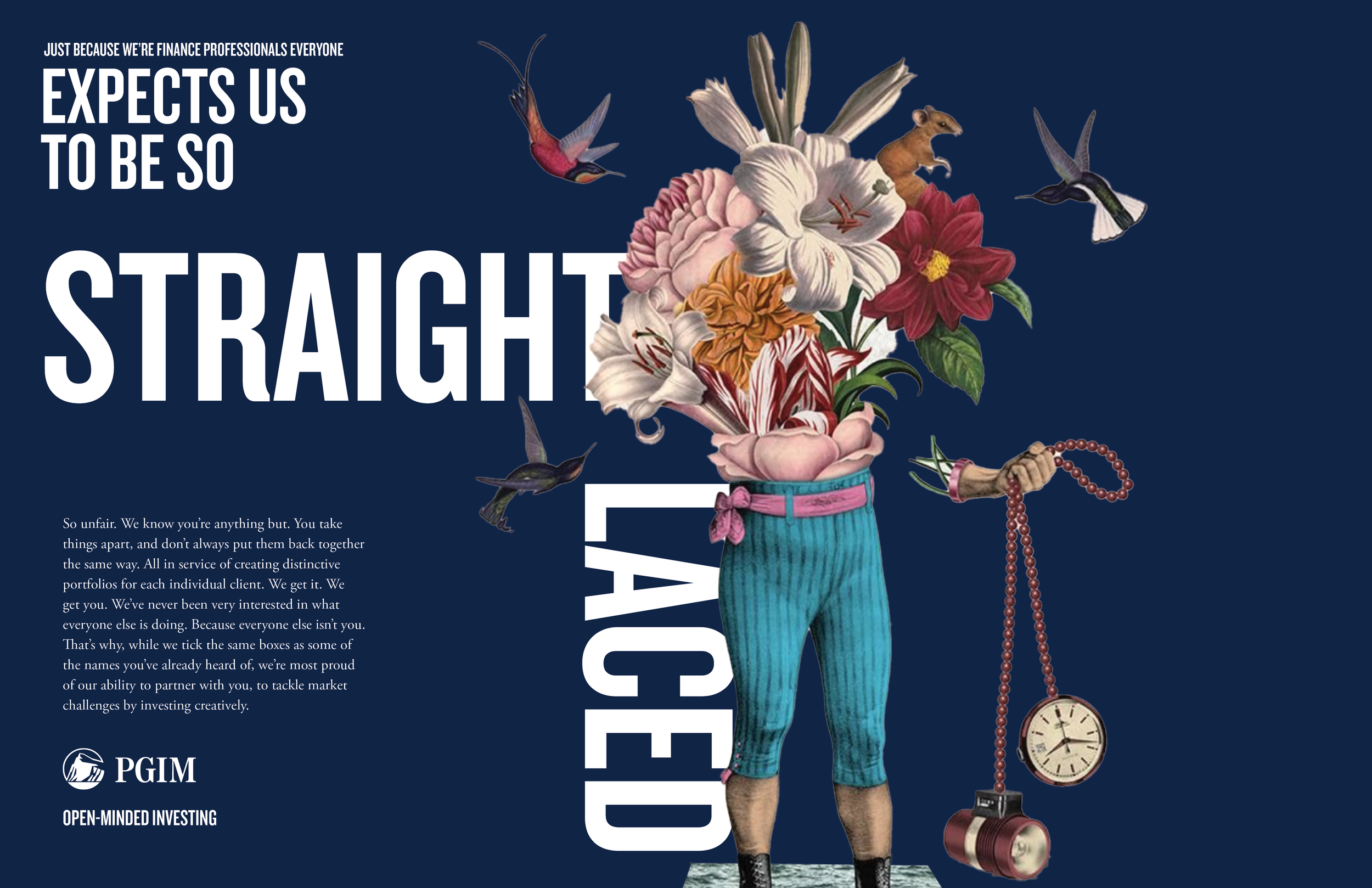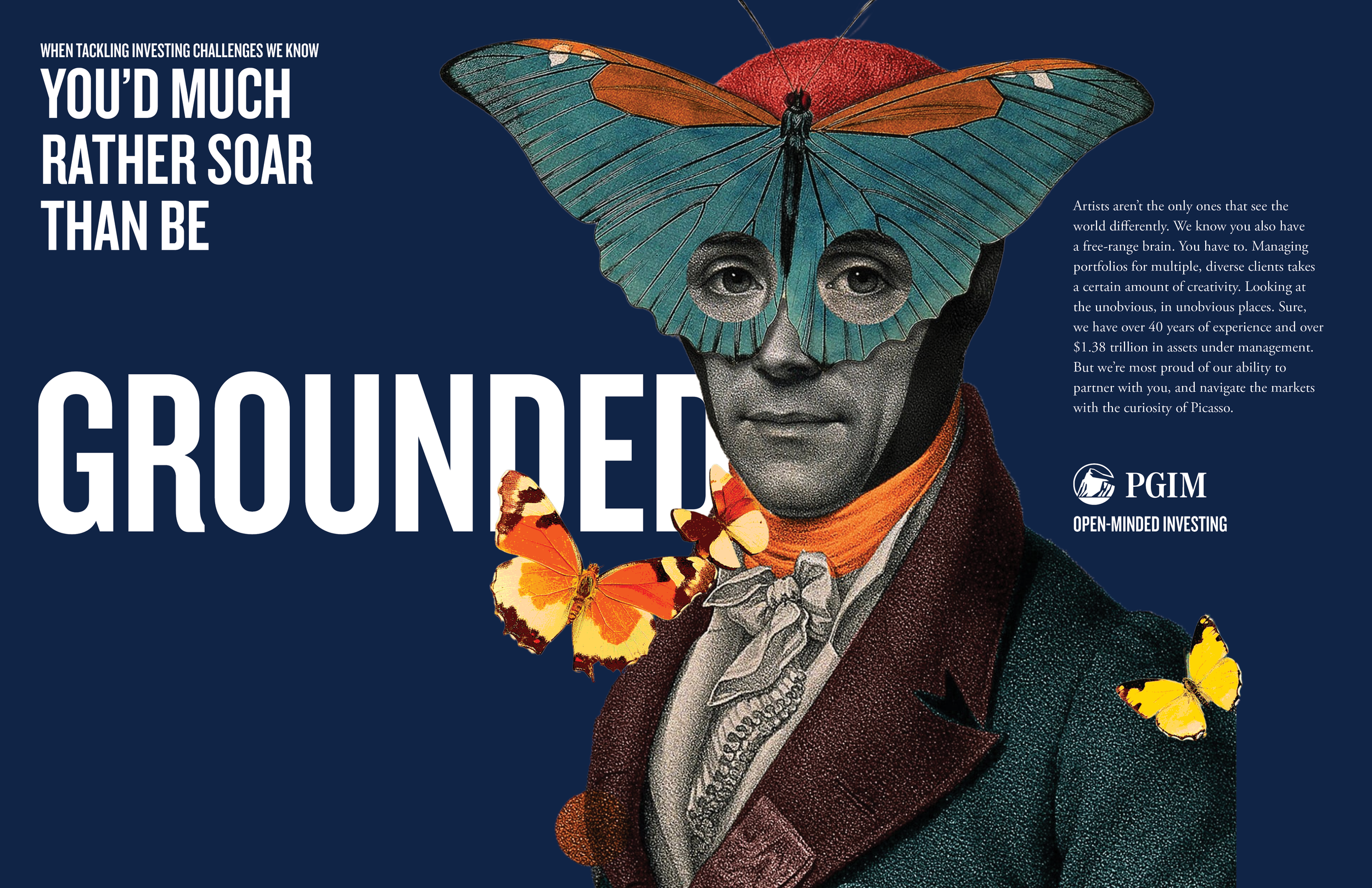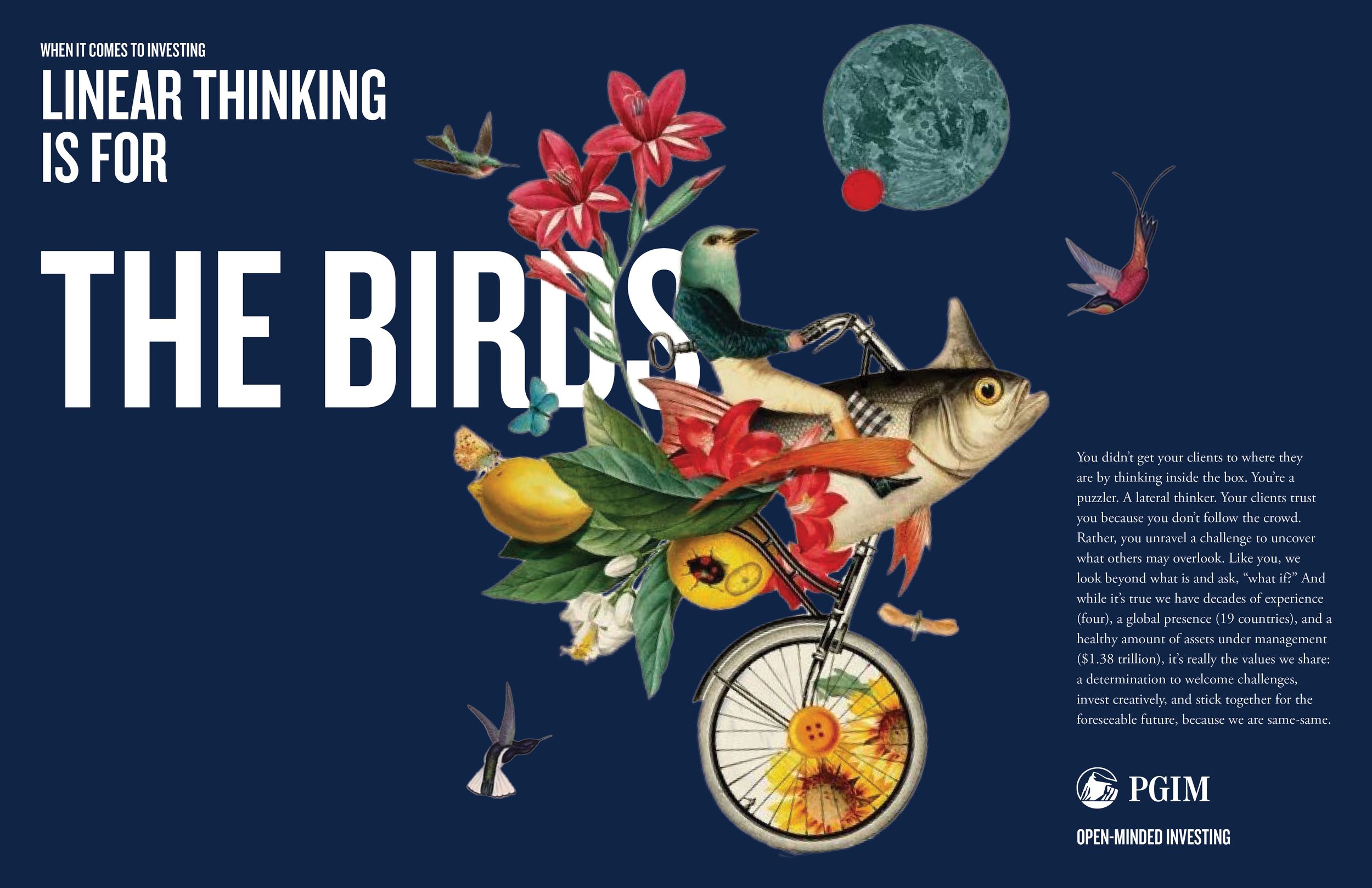 The idea: PGIM embraces lateral thinking — the perfect combination of curiosity and creativity. We partner with artists who see the world differently, piquing curiosity with an open-minded image and an explanation of why seeing things differently sets us apart from the crowd. The work involves a system of print spreads, paid/ organic social media, and animated banner placements. The campaign brings an imaginative, custom look for imaginative, custom solutions. I drove the creative idea and executed from conception to end-to-end production. Lead creative and copywriting by Lisa Leone, artwork by Randy Mora and Beto Val.